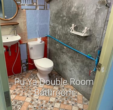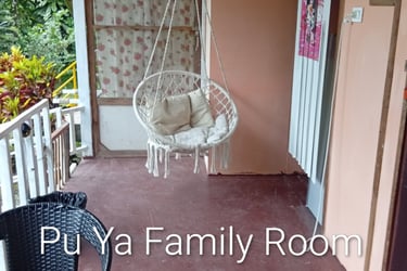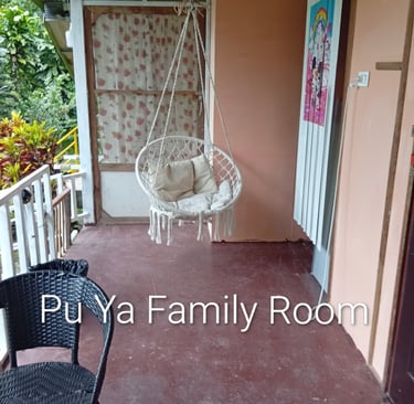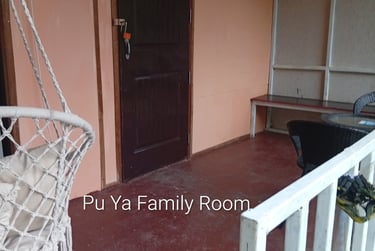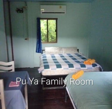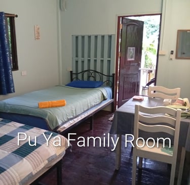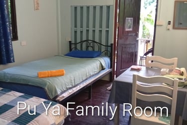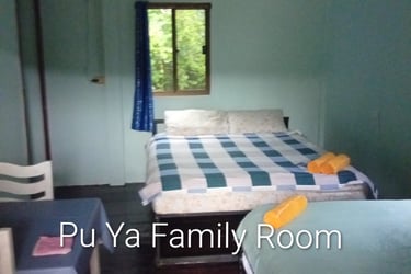 PU YA IS A SMALL HOMESTAY IN AN IDYLLIC JUNGLE LOCATION. IT CONSISITS OF ONE AIRCON FAMILY SUITE WITH PRIVATE BATHROOM WHICH SLEEPS 4 PEOPLE OVER 2 ROOMS AND ONE AIRCON DOUBLE ROOM WITH PRIVATE BATHROOM. THERE IS A SHARED KITCHEN AREA WITH MICROWAVE, KETTLE ,TOASTER AND RICE COOKER. ALL GUESTS CAN ENJOY FULL ACCESS TO OUR FACILITIES AT CHOR CHABA INCLUDING HOT SHOWER, AND POOL TABLE